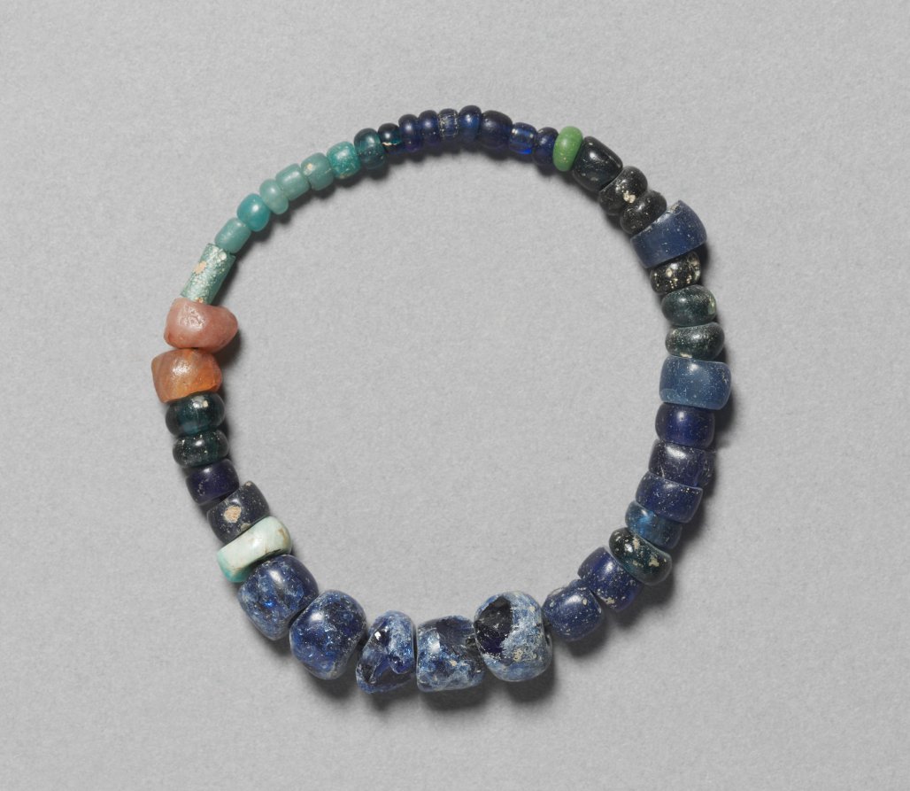 An enormous amount of beaded strings and necklaces were excavated from Silla tomb sites. Glass, largely produced in ancient Rome since the late 1st century, also reached the Korean peninsula through the Silk Road, the ancient global trade route. Yet cobalt blue glass beads shown in this string are highly likely to be soda glass produced in the Silla territory.
