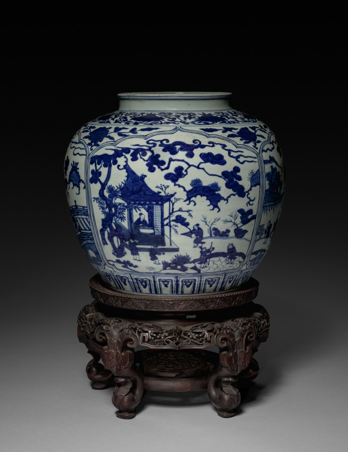 The jar is painted with vibrant underglaze cobalt blue depicting the four seasons and stages in the life of a scholar-official. In the first scene, a scholar leaves his home in spring hoping to pass the civil service examinations in the city. In the autumn scene, he successfully returns on a horse, prepared for a career at court. The summer scene shows him as an aged man watching his offspring play along a lake. The winter scene depicts him writing while attendants offer him hot tea and break the ice for fresh water from the pond in the foreground.