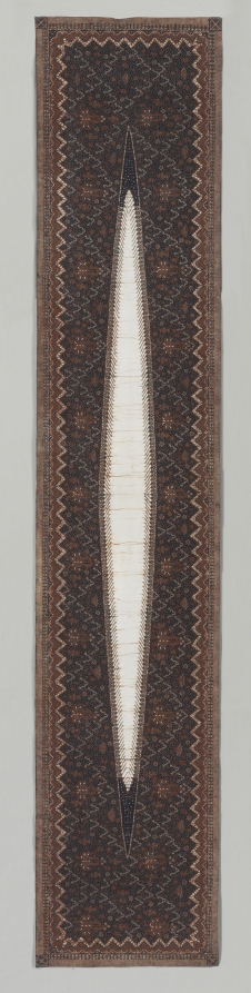 Batik is an ancient technique that was practiced in India and throughout much of Southeast Asia. With the invention of the "canting" (a tool used to apply hot wax to fabric) in the 17th - 18th centuries, however, batik bacame a particular speciality of Java. This batik was produced in the central regions of Java where cloths were resist-dyed with traditional designs in white, indigo blue, and dark brown. The stylized wing and tail of the mythical bird Garuda and the sacred mountains seen here had cosmic significance and were reserved for textiles worn by nobility for ceremonial occasions or for dance costumes. The white, elongated diamond-shaped center is unique to batik shoulder cloths.