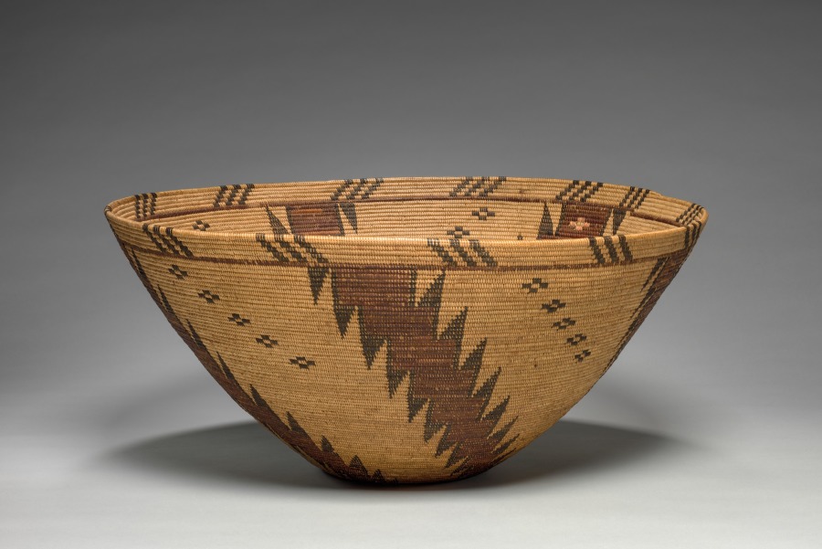 This basket was made for the Euro-American collectors’ market in the early 1900s but it is modeled on basketry bowls from which the Timbisha (Panamint) Shoshone once served food. When used indigenously, the main view would have been of the interior. The two small, pink crosses, made of flicker (woodpecker) quills, may be a maker’s mark. Made-for-sale baskets testify to Indigenous women’s truly creative, resilient responses to forces that endangered their livelihoods and existence.