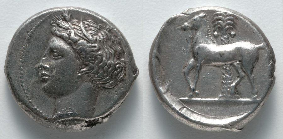 Tetradrachm: Head of Tanit-Persephone (obverse); Horse (reverse) by — VisualArtsDB