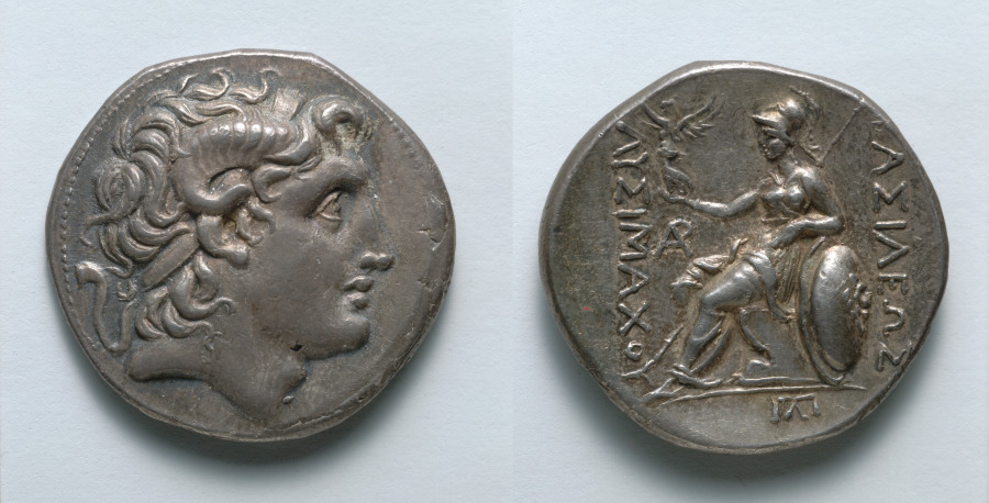A contemporary of Alexander the Great and one of his generals, Lysimachos used coins like this one to emphasize his connections to the fallen leader. The images of the goddesses Athena and Nike, or Victory, on the reverse, together with an inscription naming King Lysimachos, further legitimize his reign, first in Thrace and then in parts of Macedonia and Asia Minor.