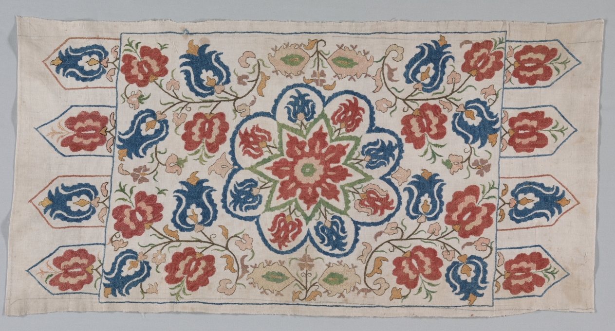 plain weave: linen; embroidery, self-couching and herringbone stitches: silk