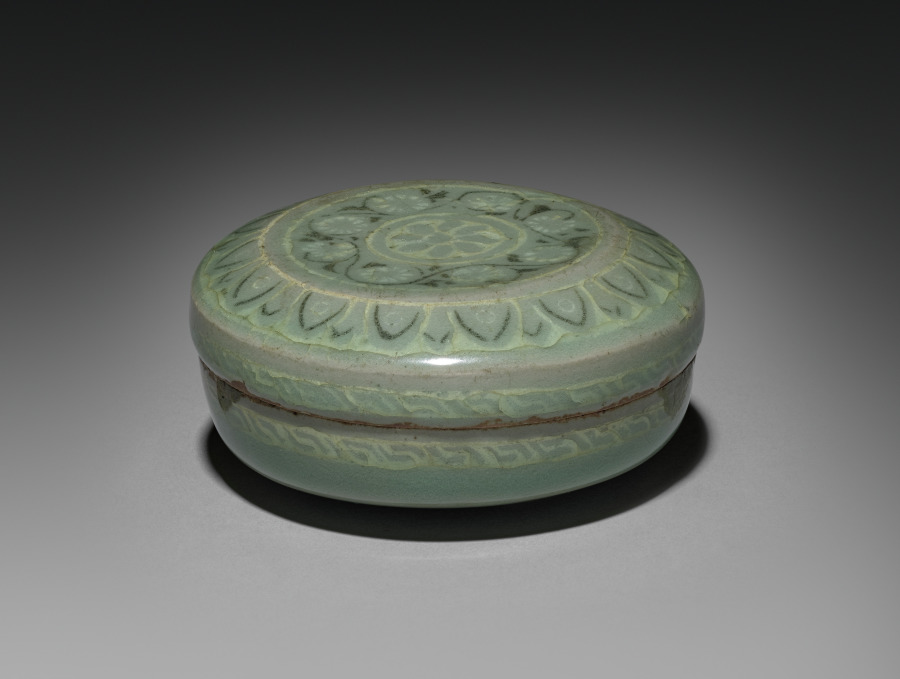 Celadons, spoons, seals, and bronze mirrors were the most common burial objects in tombs during the Goryeo period (918-1392). Once used to contain color powder, rouge and eyebrow gel for makeup, this small container was one of the standard goods that furnished elites' tombs. Goryeo-period women and men used the grain powder of rice or millet for whitening their skin, safflower extract for rouge, and plant ash or soot for eyebrow gel. Yet, natural-looking make-up seems to have been the most favorable one in Korea according to the travelogue by Xu Jing (1091-1153), the Chinese diplomat who visited Korea in 1123.