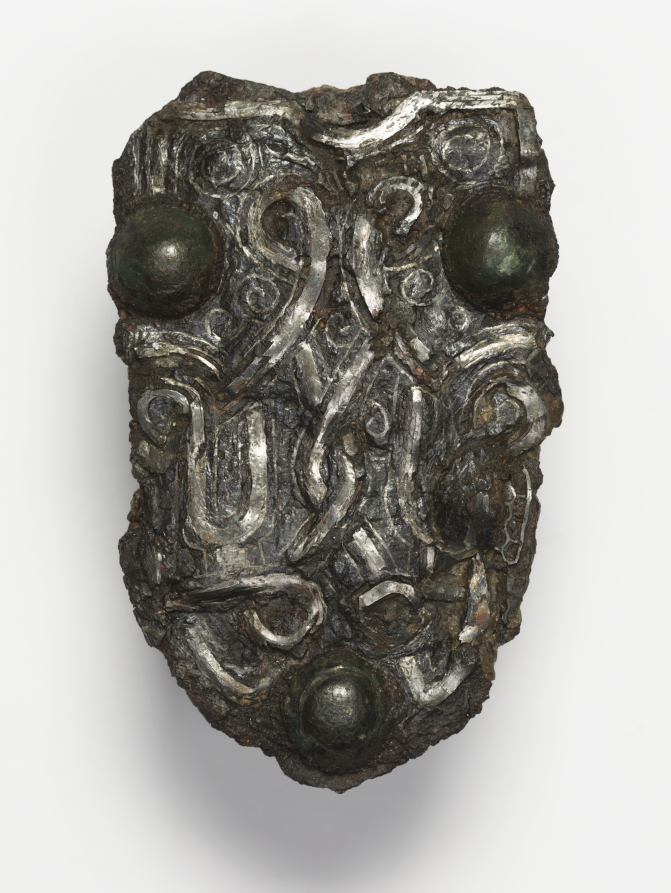 This tab would have been attached to a strip of leather worn around the waist. It was likely both an ornamental statement indicating social rank and a practical accessory. The decorative inlay was applied by forcing silver wire into a pattern engraved into the iron. The condition of the tab indicates that it was likely excavated, perhaps from a grave.