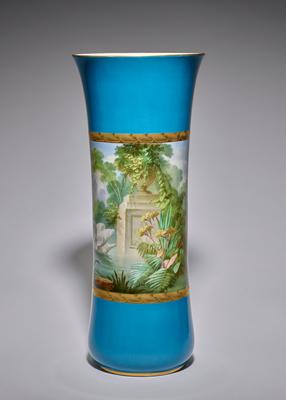 This pair of vases was displayed at the 1867 Paris Universal Exhibition in the booth of Parisian ceramic manufacturer J. Klotz. The official catalogue of the Paris exposition indicates Klotz was one of four French entrepreneurs to display porcelain wares painted and decorated by the chromolithographic process. The adaptation of color printing techniques to ceramic production was one of the innovations celebrated at the 1867 exposition.