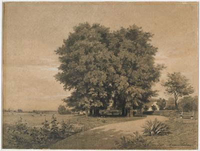 Maxime Lalanne was an influential proponent of the charcoal landscape. He made his Salon debut in 1852 with a group of charcoal drawings and continued to exhibit such works for the next thirty years. His subjects often reflected the environs of his native Bordeaux. In fact, this drawing quite possibly shows the grounds of his own home. To highlight certain areas of the composition, Lalanne added white gouache (on the foreground plants) and a gentle dusting of white chalk (mainly on the leafy trees).