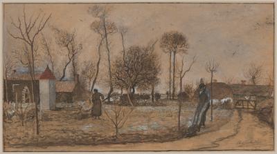 In 1905, Charles Milcendeau bought a farmstead in the heart of the Vendée marshes, near his hometown of Soullans in western France. Depicted here is his modest house with its distinctive doorway, painted to look like a pointed stone arch. The barn at right contained his studio. The brown leaves and barren trees signal that the workers could be engaged in an early spring cleanup. To make this very personal drawing, Milcendeau combined various media, including ink, watercolor, gouache, crayon, and charcoal. Today the buildings serve as a museum dedicated to the artist’s life and art.