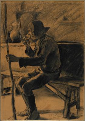 A substantial portion of Charles Milcendeau’s oeuvre features people drinking, sometimes alone, sometimes in a tavern. Since his parents were innkeepers, it was a milieu the artist knew well. He tended to study his sitters, typically countryfolk, with care, here delineating the traditional peasant’s hat, leggings, and sabots (wooden shoes). Milcendeau lavished equal attention on the light, which floods the room from a low angle at the left. The long, deep shadows tell us that it is late in the day, an indication that the man’s drink is probably a well-earned reward after long hours of hard work.