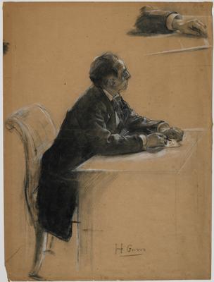 Henri Gervex was one of the leading artists of France’s Third Republic. This sketch of a clerk at his desk, on inexpensive tan paper, appears to be the only surviving preparatory drawing for a The Civil Marriage, a large painting he made for the city hall of Paris's 19th arrondissement. Following the standard training of the École des Beaux-Arts (School of Fine Arts), he worked up preliminary sketches for the entire composition. In this sketch of the clerk at his desk, on inexpensive tan paper, Gervex took pains to get the angle and position of the figure’s left hand exactly right, as evidenced by the additional version in the upper right corner of the drawing. The finished painting shows the clerk as an older, balding figure whose interest in the ceremony appears less acute than the figure as originally drawn.