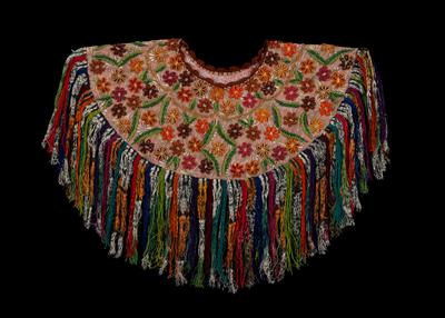 Synthetic fibers, metallic threads, beads, cotton, metal stud; needlework