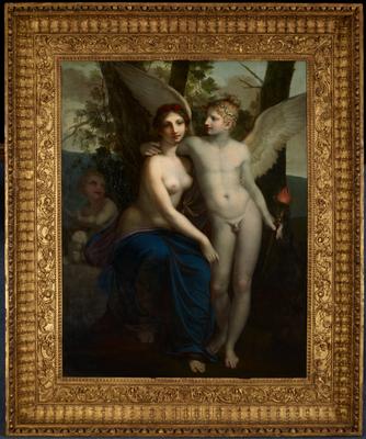 Pierre-Paul Prud'hon was known for his allegorical paintings. The winged youth holding a torch is probably Love, portrayed as the Roman god Cupid, and the female figure would then represent Friendship. The theme is most likely the union of these two ideals, indicated by their embrace. Prud'hon's inventive allegories often remain enigmatic, however, and other interpretations are possible. The rosy-skinned female figure may personify the art of painting and her pale companion the art of sculpture. Or the two may be Cupid and Psyche, whose love affair is recounted in ancient Greek and Roman literature. The impressive frame is itself an important work of French Neoclassical art. The carved ornament embodies le goût grec (‘Greek taste’) style of the late 18th century, influenced by the resurgence of interest in the classical world and archaeological excavations. Conservation of the frame was generously funded by Nivin MacMillan and Mary O. Olson.
