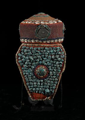 Beads, cotton, metal, turquoise, bone (?), cowrie shells, animal teeth, coral