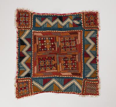 Cotton, cowrie shells; needlework