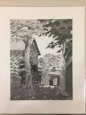 Throughout his career, Tanaka never wavered from his depiction of life in Japan, but he altered the perspectives he placed his viewer. In this print, he illustrates a sun-dappled road covered by an archway formed by two massive trees growing on either side. The houses on the side and at the end of the road have roof tiles and wooden sides of old architecture. Working with the limited palette of etching, Tanaka conveys the light pouring through the branches by varying the density of the leaves and using a spectrum of grays. One can imagine standing in the middle of the road, between the two trees, listening to the chirping of birds.
