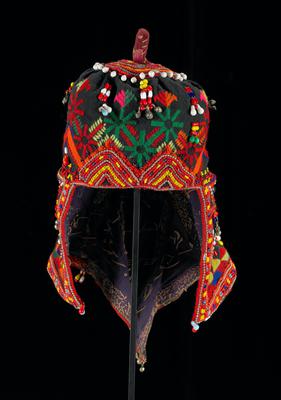 Cotton, beads, metal ornaments, synthetic fibers (?)