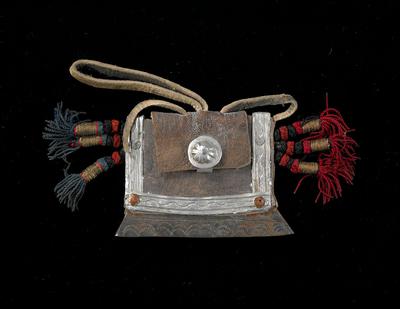 Leather, metal, silk (?), metallic threads
