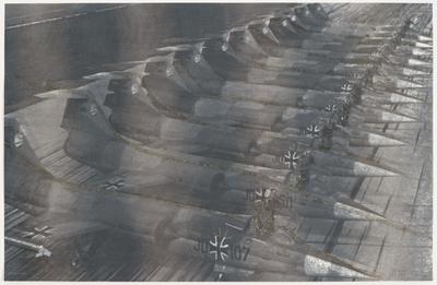Wolf Vostell screenprint Starfighter I is one of six prints produced by six artists comprising the widely acclaimed portfolio Grafik des Kapitalistischen Realismus (Graphics of Capitalist Realism). Published in Berlin in 1968, this portfolio of graphic art also featured the work of the German artists Sigmar Polke, Gerhard Richter, Konrad Lueg, K.H. Hodicke, and K.P. Brehmer, who were the founders and chief proponents of the Capitalist Realism movement. It remains the definitive graphic statement of this politically-inspired artist group. The subject of Vostell’s screenprint is the Lockheed F-104 Starfighter, a supersonic fighter jet aircraft that saw service in the U.S. Air Force between 1958 and 1975. The fighter was marketed around the world, and became part of West Germany’s controversial plan for rearmament during the Cold War to help counter the military power of the Soviet Union and its communist allies in Eastern Europe. Notorious for its frequent crashes, the Starfighter was nicknamed “the widow maker” and was emblematic of West German corruption after it was disclosed that Lockheed had paid bribes to various government officials during sales negotiations. Political artists such as Vostell subsequently used the image of the Starfighter as a symbol of militaristic and market-driven values. For his screenprint, Vostell appropriated a grainy still image from a televised broadcast that shows a seemingly infinite row of Starfighter jets precisely aligned along a runway. He “decorates” the row of fighters with silver glitter to both de-mystify and satirize Germany’s long history of military prowess and tradition. In so doing, he critiques the corrupt West German government and its Cold War policies of “defensive rearmament” and Western political alignment (NATO). Despite its critical stance, the shimmering image of modern jet fighters possesses a compelling visual power, or even disquieting beauty, that actually softens Vostell’s intended message.