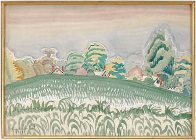 Charles Burchfield described this scene in a letter dated May 3, 1963: “A sunny morning at the season when plant life is in its first lush growth – little houses ‘peek’ out at the beholder from behind a meadow of fresh young oats (The edge of Salem, Ohio).”