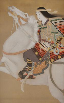 Tomoe-gozen was a female samurai warrior from the late 12th century, admired for her beauty and fighting skills. She holds a halberd-like weapon in her left hand called a naginata, the predominant weapon for fighting on a horse.
