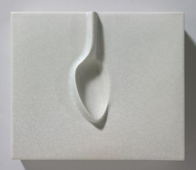 This minimalist tile—a spoon rising from its surface—is one of many explorations of impressions in Kivivirta’s mostly two-dimensional tile work. It is a notable example of how her tiles provide interest and variety for interiors, following in the artistic tile traditions of the Netherlands in the 1600s to 1700s and Britain in the 1800s.