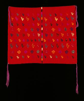 Men in Chichicastenango no longer wear traditional everyday dress (traje), but their ceremonial traje is among the most spectacular in the Guatemalan highlands. Loosely patterned after a Spanish matador's costume, the heavy woolen jacket and pants are opulently embroidered in silk or synthetic silk floss, often by the owner. One large red tzute is carefully arranged as a head covering, while an additional tzute may be worn over the shoulders or used to carry ritual objects or candles during ceremonies. This ceremonial attire is reserved for men selected to serve the community as a member of the cofradía, a religious group. The size and intricacy of this motif indicates the man's relative standing within the community. Young men have rather small designs, reflecting their youth and inexperience; as they grow and mature they embroider larger, more elaborate embellishments.
