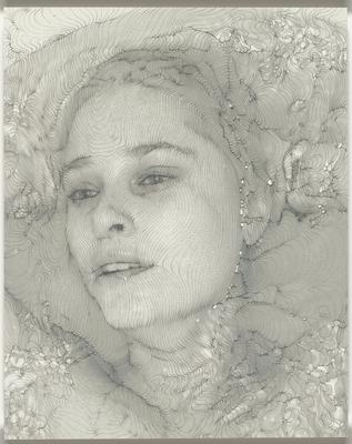 Sebastiaan Bremer’s Ave Maria 8 is part of an extended series of unique altered photographs of the artist’s Brazilian-born wife, Andrea, posing nude in a water-filled bathtub. Bremer made the underlying photograph in his Manhattan apartment more than twenty years ago, before the two were married. The image is timeless articulation of female beauty and desire, a familiar interpretation born of the male gaze. And yet, once one is aware of the close relationship between artist and subject, the portrayal takes on another meaning, that of a shared intimacy frozen in time, residing simultaneously in the past and the present. Ave Maria 8 features the artist’s obsessive overpainting technique that embellishes the image with ornate dot patterns that form networks of sinuous undulating lines that follow the contours of the underlying forms and heightens the shimmering effect of the rolling water, while also emphasizing the smoothness of the model’s face. Bremer’s evocative portrait is a tour de force of calligraphic drawing, a celebration of beauty and an intimate dialogue between the artist and his wife.
