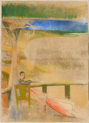Irving Petlin’s enigmatic, dream-like landscape features a lone seated figure who looks away from the vast, bucolic landscape that lies before him and instead gazes intently at the viewer. His pensive expression heightens the scene’s mystery. Who is this young man? Why does he look directly at the viewer? What is he thinking about? Completed when Petlin was 49 years old, the drawing may in fact be a retrospective self-portrait, a midlife deliberation on the persistent uncertainties of life and his place in the modern world. In this interpretation, the drawing’s title suggests that Petlin is the one wrestling with a restless spirit.