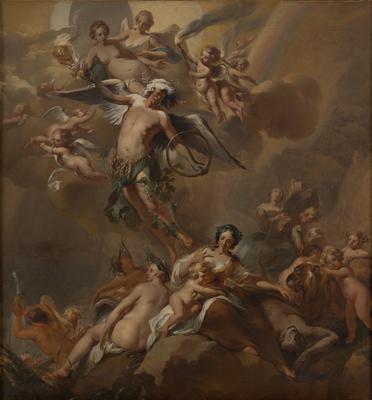 The subject of Nicolaes Berchem's cabinet picture is a puzzle. The Dutch Italianate painter specialized in landscape painting but also produced a small group of complex allegories, celebrated for their sophistication and skill. Here, Time is personified as an aged man with wings, floating above a faintly painted wheel of the zodiac. He holds a serpent eating its tail (a symbol of eternity) and flowers (a symbol of spring). The other three seasons are depicted in Time's attire: his crown of dried branches for winter, ears of grain for summer, and grapes for autumn. The moon and sun reflect the separation of night and day, and the four elements are represented in the four quadrants of the painting: fire and air above (the celestial sphere), water and earth below (the terrestrial sphere). Further meanings can no doubt be decoded in the other mysterious figures Berchem has woven into the composition. Professor Norman Canedy, who gave the painting to the museum, proposes a political interpretation, suggesting the female figure nursing the chubby putto at center personifies the Dutch Maiden, a national symbol adopted by the Netherlands during their war of independence against Spain (1568–1648). The Dutch Maiden is often accompanied by a lion, and Berchem represents one gazing faithfully at the woman and gently licking her arm, which rests on the vanquished enemy.