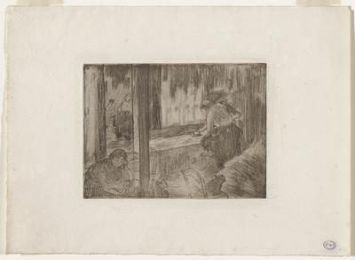 In the 1800s, many artists began to depict the lives of people who worked with their hands for a living. In The Laundresses, Edgar Degas depicts women working and resting in a dank, melancholic space. In the left foreground, one rests, warming herself near a stove with a pyramidal top used to warm irons. At the lower right are large bundles of laundry. In the middle ground, two women work at the ironing board. In an adjacent room in the background, two woman stand in the shadows. In the far room, through the opening above the ironing board, we may be seeing steam rising from the washtubs. Shadowy garments hang to dry from lines above. Degas reused a copper plate on which Mary Cassatt had previously made an aquatint. Most, if not all, of the aquatint in the image was made by her. Degas worked on the plate through four successive states. This impression is from the fourth state. Mia’s collection also includes the first state (accession number P.75.44). Compare the two to see how Degas changed in his image.