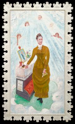 This loving portrait is a memorial to Florine Stettheimer’s childhood nurse, teacher, and guide, Margaret Burgess. Burgess was an Irish Catholic immigrant who arrived in the U.S. at a peak time for Irish arrivals fleeing famine and its aftermath. Between 1820 and 1930 about 4.5 million Irish arrived in this country. They were met with prejudice and persecution, took jobs others would not, and yet made strong communities despite the culture shock of leaving a rural existence for urban centers. Burgess’s role as a domestic worker for the well-to-do Stettheimer family made her one of the lucky ones. Stettheimer’s devotional image honors Burgess’s role in the family and her Catholic faith. She stands in the heavens before an altar to the Virgin Mary, clouds pooling at her feet, in glorious divine light. Florine and her four siblings surround her as winged seraphim. An added flourish is the artist’s frame, carved perhaps to reference to Irish lace. Conservation of the artist's 1929 frame was made possible by a generous contribution from Paula Vesely through the Art Champions program.