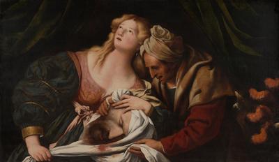 Conservation of this painting was made possible by a generous contribution from Kevin and Leela Joseph Scattum. As told in the Bible, the Jewish heroine Judith saved her people by decapitating the Assyrian general Holofernes. Here Judith looks heavenward for guidance, as she and her maid, Abra, wrap Holofernes’s enormous bearded head in a blood-stained cloth. At right is the general’s shiny plumed helmet, now forever empty. The picture reflects Pietro della Vecchia’s interest in imitating century-old art, evident here in the women’s small figural proportions and the antiquated facial types. He sometimes even produced forgeries imitating works by famous Venetian artists.