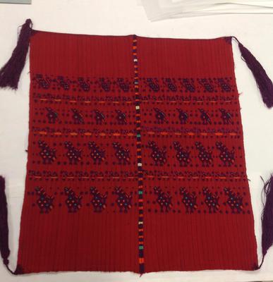 Tzutes are multi-purpose cloths that are worn as part of Maya everyday dress. When used for ceremonial occasions, they appear most commonly as a headdress. This particular style is for men, and was worn with the cloth folded diagonally. The fold was then placed low on the forehead, with the two ends tied and draped in back. For certain religious functions, tzutes are removed from the head and placed instead over the shoulders. The bright red color and rows of birds mark this piece as coming from the Santo Tomas Chichicastenango area. Each Maya region employs distinct colors and patterns in their textiles, so that, historically, where someone lived could be identified by the appearance of their garments.