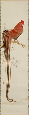 Onagadori are roosters specially bred in Japan for their long tail feathers. Here, Shibata Zeshin depicted an extraordinary specimen whose feathers hang to the ground from the rooster's perch on a plum branch. Typical of Zeshin's style, the bird is rendered with superhuman precision, with each feather of its luxurious plumage carefully delineated in lustrous pigments.