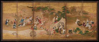 This colorful screen illustrates a favorite Japanese seasonal pastime, viewing crimson maple leaves in autumn. Within a curtained enclosure, two luxuriously clothed women, surrounded by their attendants, are enjoying music and refreshments laid out on elegant black and red lacquer serving dishes. On the far left, a group of women heat rice wine (sake) over a small fire fueled by dried maple leaves. A foot soldier announces the arrival of his superior, shown in a blue patterned kimono and plaid jacket on the far right. An elegant folding screen in the background—much like the one on which this scene is painted—illustrates how these objects were used both indoors and out for privacy and protection against the wind.