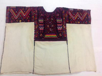 Huipiles from Chichicastenango exhibit a wider range of imagery than those from other villages. The oldest design still in use is the double-headed eagle, which has evolved from a geometric, yet recognizable representation to the highly abstracted forms seen here. Other huipiles feature geometric motifs, such as the multi-colored zigzag, while contemporary examples exhibit naturalistic floral imagery adapted from European needlework patterns. (Please visit the first floor Family Center to view this style of huipil.) Despite the variety of designs, huipiles from Chichicastenango are instantly recognizable by the appliqué and embroidery sunburst that encircles the neck opening. Black taffeta rosettes are often applied at the shoulders and are said to symbolize the moon.