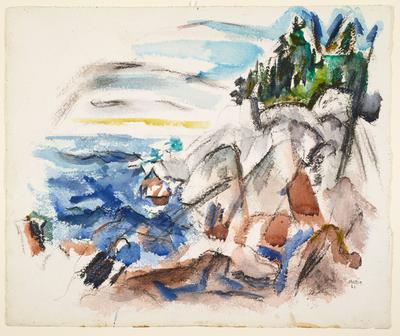 In establishing his modernist style, John Marin frequently turned to the untamed landscape for his subjects, especially the landscape of Maine. The New Yorker visited Maine every year, spending the summer of 1921 in Stonington, a picturesque fishing village on the southern shore of Deer Isle, one of the many islands along Maine’s coast. The Sea, Maine is a plein-air interpretation of the island’s rugged shoreline of granite outcroppings and windswept pine and spruce. In this dynamic meeting of land and sea, Marin united abstract and representational impulses, using gestural strokes, bold colors, and delicate washes to denote nature’s essential forms. His line and brushwork have an urgent, improvisational quality, conveying the rhythm and motion of wind and surf.