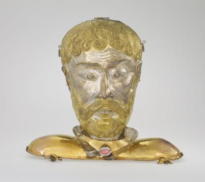 This reliquary was designed to enclose the cranial remains of Theobald Roggeri (1100-1150) of Alba, a northern province of Italy. Because the style of head reliquaries did not change much over time, it is difficult to date this piece exactly. The face has the stylized features of the Romanesque (eleventh and twelfth centuries) period but also draws from the Gothic period (thirteenth and fourteenth centuries) in the detailing of the beard and its facial modeling. In the Middle Ages, saints were models for Christian behavior and people made pilgrimages to visit their tombs or relics. Relics could be any object belonging to a religious leader-from the veil of the Virgin Mary to a splinter from Jesus' cross, the knucklebone of a saint, or the burial shroud of Jesus. Relics were often collected and placed in elaborately adorned caskets or boxes, some of which resemble miniature buildings or the relic itself.