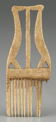 Tribes within the Iroquois Confederacy carved effigy combs from wood, bone, and antler. They were worn in the hair and were created for utilitarian and decorative purposes. Images of animals like horses, bears, and birds were often incorporated into this type of comb. This one features two cranes facing each other, probably referring to the owner's clan affiliation.
