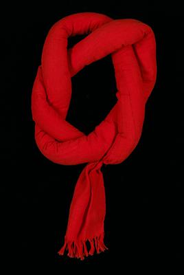 This bold, red headdress is of the type often referred to as "coral snakes." Coral snakes are worn exclusively in the village of Tamahú. According to Mayan belief, snakes are harbingers of rain, often depicted in visual expression as long, zig-zag forms. In this way, snakes are equated with lightning, a symbol of life-giving rain and a link between the heavens and the earth. The color red is also synonymous with life. This headdress, worn close to a woman's head, signifies the east and the rising sun, blood, fire, and a woman's ability to create life.