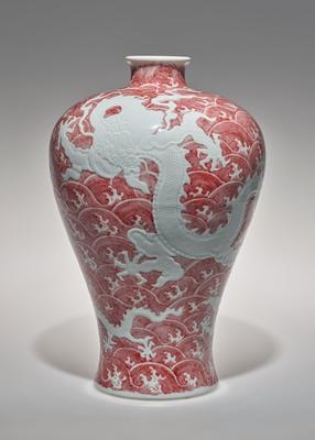 The upper part of this striking vase has relief carving with two large five-clawed dragons leaping upward with heads turned back. The dragons and two smaller ones below are shown against waves with white crests, all meticulously drawn in copper-red with tightly spaced arching lines. The design of this rare meiping is derived from an early 15th-century prototype, and examples similar to it are in the Hermitage Museum, Leningrad.