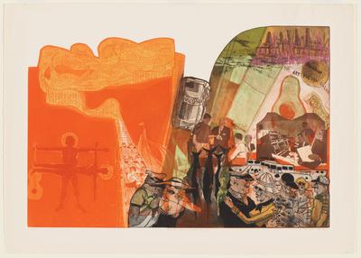 - Color drypoint, soft-ground etching, and aquatint, with roulette, vibrograver, à la poupée inking, found letterpress plates, and relief rolls through stencils on cream paper