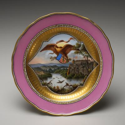 The decoration on this plate juxtaposes a romanticized, uncultivated landscape with an imposing image of Fort Snelling, Minnesota, and the Great Seal of the United States. In this rendering of the seal, the bundle of arrows, representing war, is obstructed by the olive branch, shield, and motto E Pluribus Unum (Out of many, one), to suggest peace and union following the Civil War. Fort Snelling was built in the 1820s to protect fur-trading interests and to provide a U.S. presence in the region. Following the Dakota War - fought in 1862, during the Civil War - it served as a prison camp for Native Americans who had retailiated against the U.S. government's encroachment on their lands.