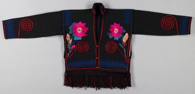Men in Chichicastenango no longer wear traditional everyday dress (traje), but their ceremonial traje is among the most spectacular in the Guatemalan highlands. Loosely patterned after a Spanish matador's costume, the heavy woolen jacket and pants are opulently embroidered in silk or synthetic silk floss, often by the owner. One large red tzute is carefully arranged as a head covering, while an additional tzute may be worn over the shoulders or used to carry ritual objects or candles during ceremonies. This ceremonial attire is reserved for men selected to serve the community as a member of the cofradía, a religious group. The size and intricacy of this motif indicates the man's relative standing within the community. Young men have rather small designs, reflecting their youth and inexperience; as they grow and mature they embroider larger, more elaborate embellishments.