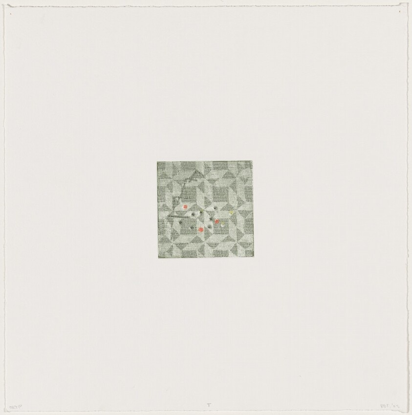 - color aquatint and drypoint from a portfolio of nine aquatints, six etchings with aquatint, six drypoints with aquatint, four drypoints, and one drypoint with etching, printed chine collé with tarlatan on wove Somerset paper
