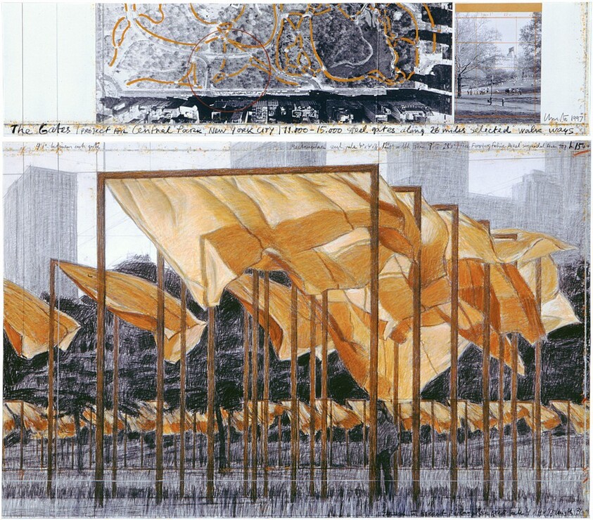 - graphite, charcoal, pastel, photograph by Wolfgang Volz, wax crayon, aerial photograph, and tape, on two sheets of paper in two parts