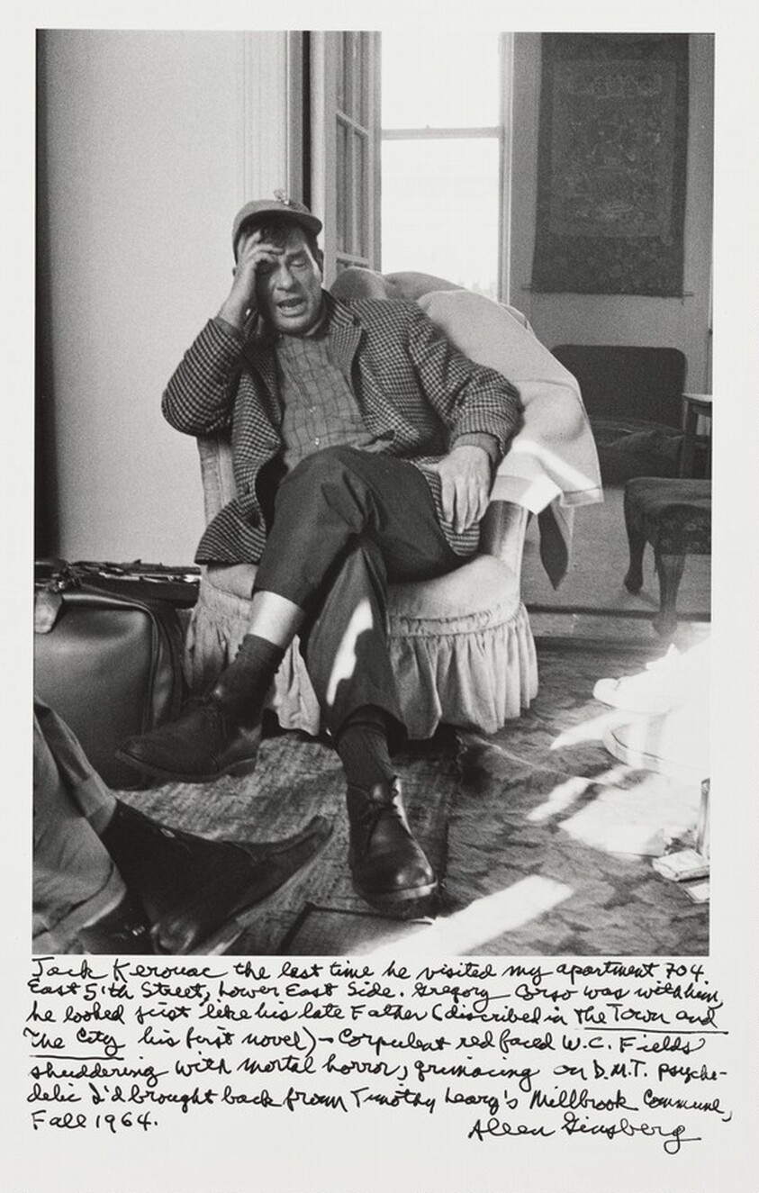 Jack Kerouac the last time he visited my apartment 704 East 5th Street, Lower East Side. Gregory Corso was with him, he looked just like his late Father (described in _The Town and the City_ his first novel) - corpulent red faced W. C. Fields shuddering with mortal horror, grimacing on D.M.T. psychedelic I'd brought back from Timothy Leary's Millbrook Commune, Fall 1964.