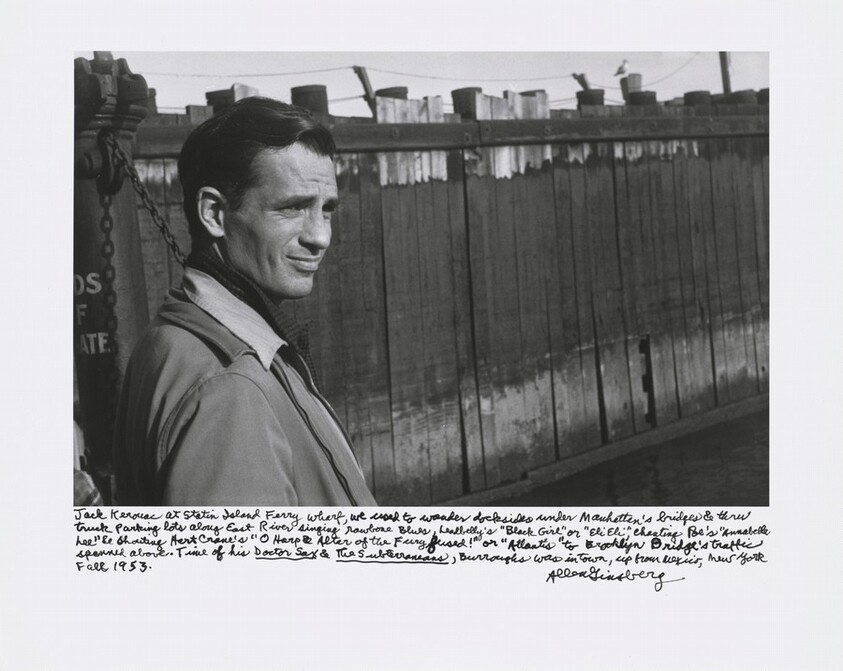 Jack Kerouac at Staten Island Ferry Wharf, we used to wander docksides under Manhattan’s bridges & thru truck parking lots along East River singing rawbone Blues, Leadbelly’s “Black Girl” or “Eli Eli,” chanting Poe’s “Annabelle Lee” & shouting Hart Crane’s “O Harp & Altar of the Fury fused!” or “Atlantis” to Brooklyn Bridge’s traffic spanned above. Time of his _Doctor Sax_ & _The Subterraneans_, Burroughs was in town, up from Mexico, New York, Fall 1953. by Ginsberg, Allen, National Gallery of Art, Davis, Gary S. — VisualArtsDB