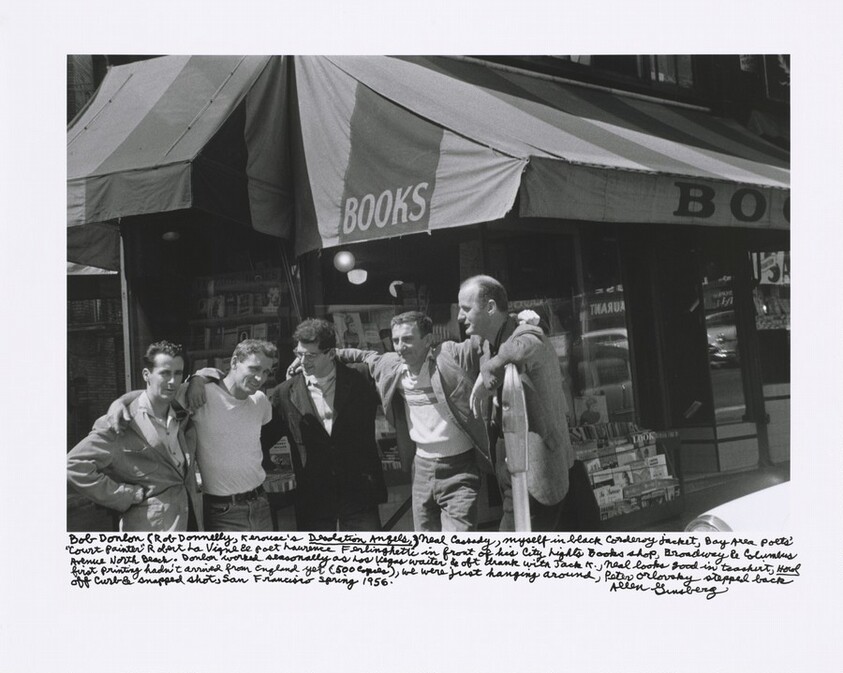 Bob Donlon (Rob Donnelly, Kerouac’s Desolation Angels), Neal Cassady, myself in black corduroy jacket, Bay Area poets’ “Court Painter” Robert La Vigne & poet Lawrence Ferlinghetti in front of his City Lights Books shop, Broadway & Columbus Avenue North Beach. Donlon worked seasonally as Las Vegas waiter & oft drank with Jack K., Neal looks good in tee shirt, Howl first printing hadn’t arrived from England yet (500 copies), we were just hanging around, Peter Orlovsky stepped back off curb & snapped shot, San Francisco spring 1956. by Ginsberg, Allen, National Gallery of Art, Davis, Gary S. — VisualArtsDB
