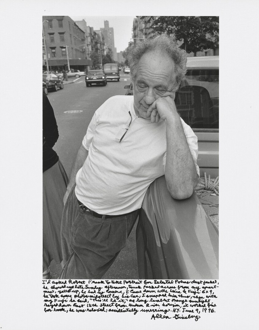 I’d asked Robert Frank to take portrait for Selected Poems dust jacket, he showed up late Sunday afternoon, truck parked across from my apartment, yelled up, he had no camera. I came down with Leica & Fuji 6×9, he took some photos midstreet by his car, I snapped him thus, then with my Fuji he said, “This’ll be it,” as long lambent orange sunlight rayed down East 12th Street from Hudson River horizon, it worked fine for book, he was relaxed, accidentally unerring. N.Y. June 9, 1996.